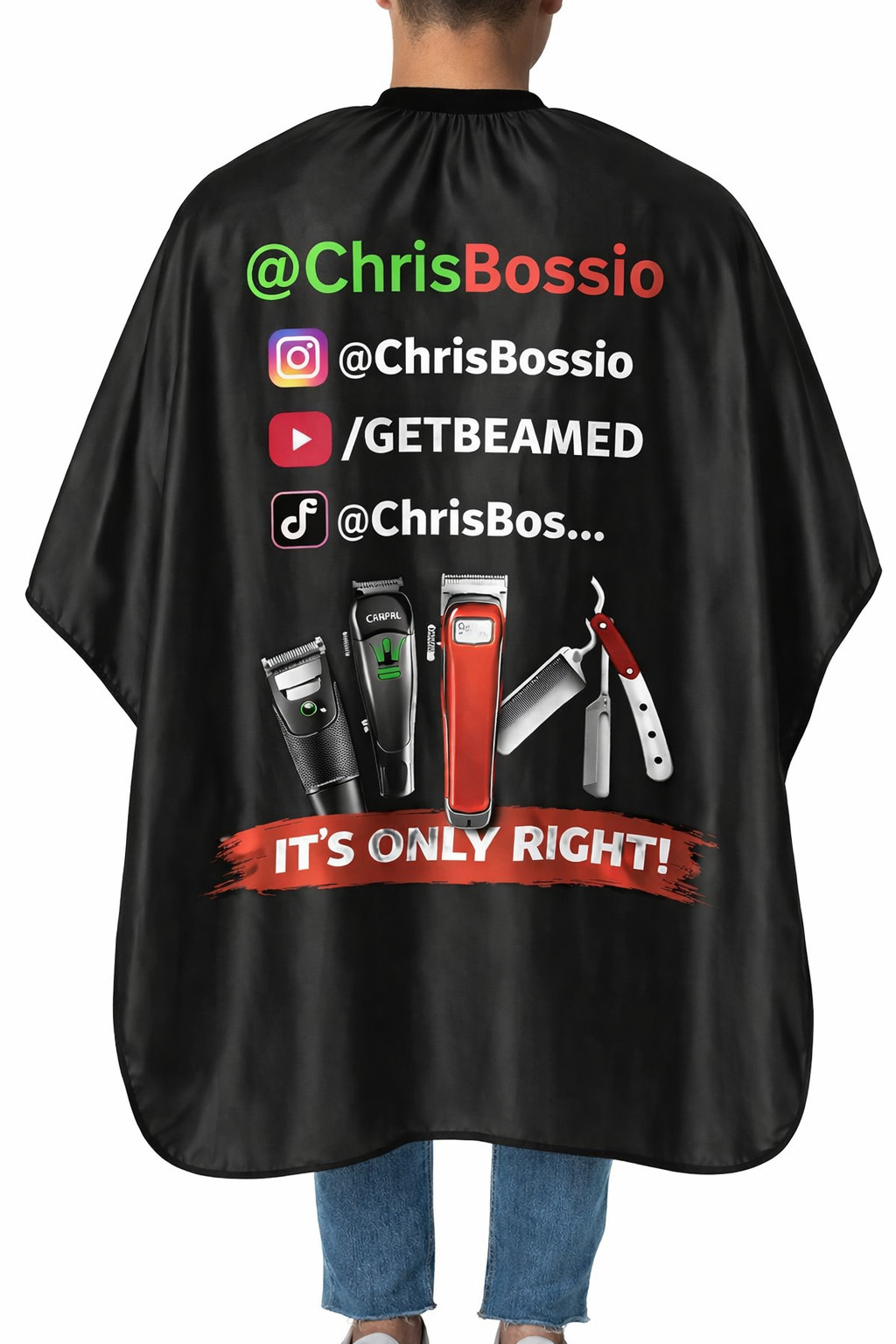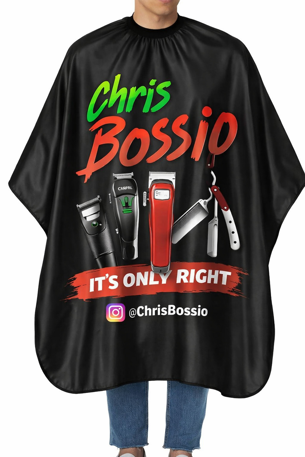The Chris Bossio Barber Cape is a bold and professional cape designed for barbers who want to stand out. Featuring eye-catching graphics inspired by modern barber culture, this cape showcases clippers, razors, and signature branding that reflect precision and confidence. It adds a premium, celebrity-level vibe to every haircut.
